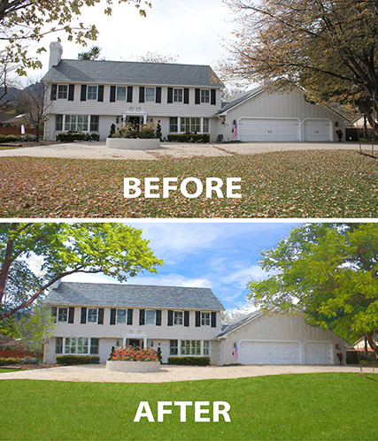 Here is an example of what can be accomplished: addition of blooming roses, trees in bloom, removal of halloween decorations, painting in green grass and a blue sky.